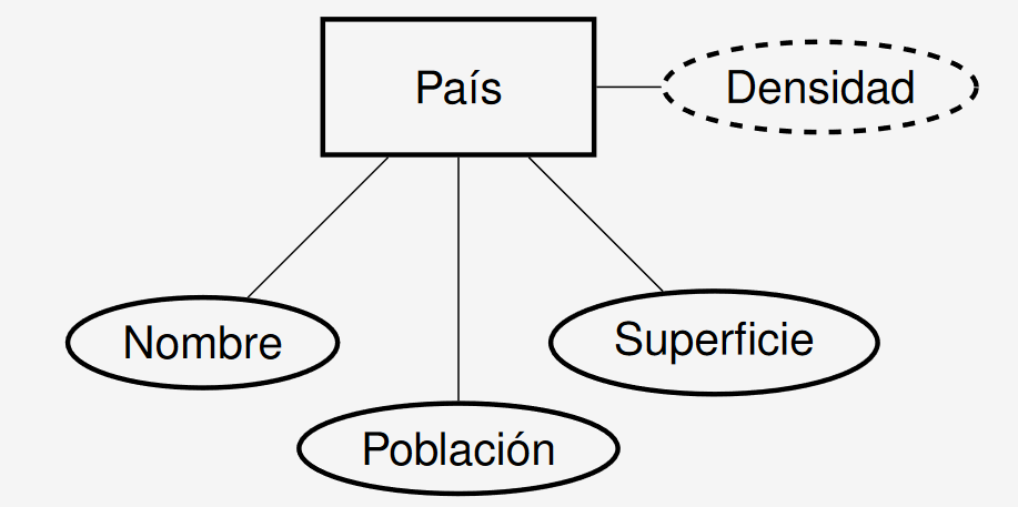 Los atributos derivados son aquellos que pueden ser calculados a partir de los datos de la base de datos (de la propia entidad, o de otros elementos). En el diagrama, se representa con un óvalo punteado.