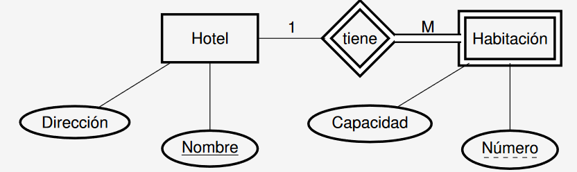 Cuando una entidad depende de otra, se dice que es una entidad débil. Su clave se compone de las claves de sus entidades identificadoras, más normalmente algunos atributos propios, que se denominan discriminantes.