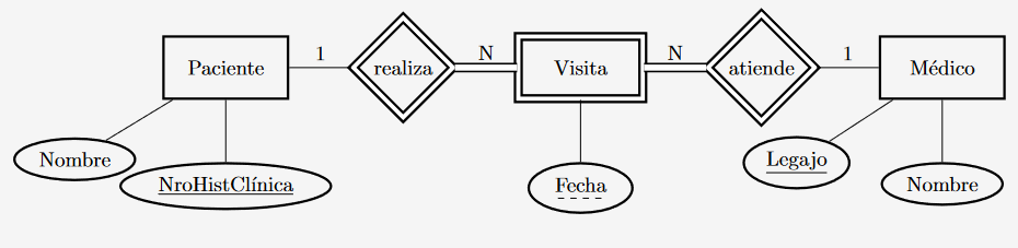 A veces, la identificación de una identidad depende de su interrelación con otra entidad, a la cual está subordinada. Esto se denotará con un rectángulo que englobe tanto el tipo de entidad como la relación que lo identifican.