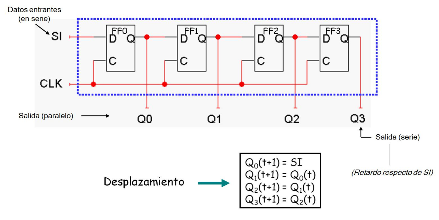 Cada Flip-Flop D está conectado con el siguiente, por lo que cada uno copia la entrada del Flip-Flop anterior con un pulso de reloj.