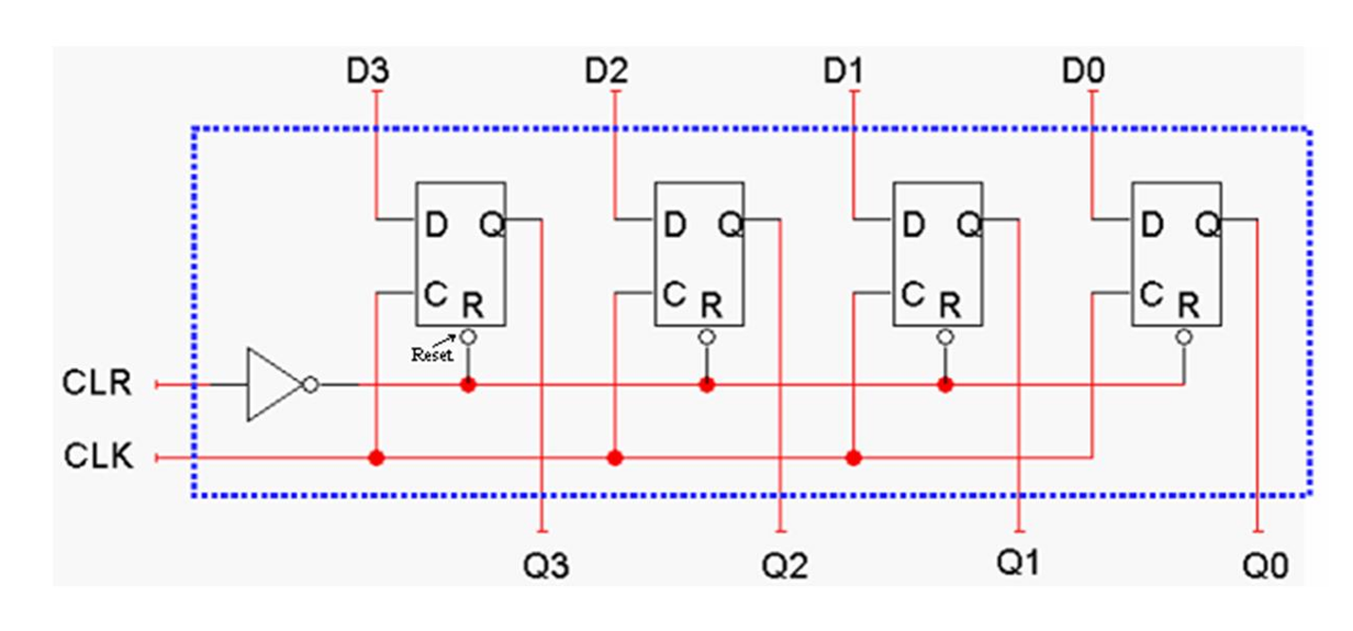 Con cada ciclo de reloj, la entrada de 4 bits es copiada en la salida.