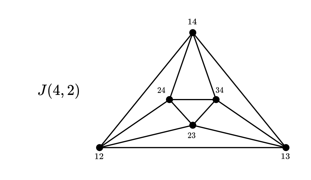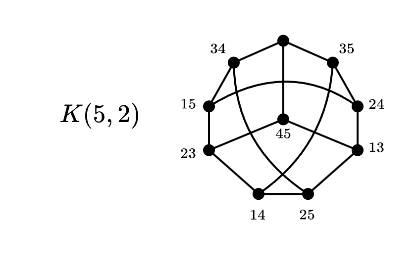 Para las aristas, cada vértice será adyacente a aquellos nodos con los cuales no comparta elementos, luego esto es el número combinatorio , Como cada arista se contara dos veces, dividimos el número en dos. Tendremos entonces