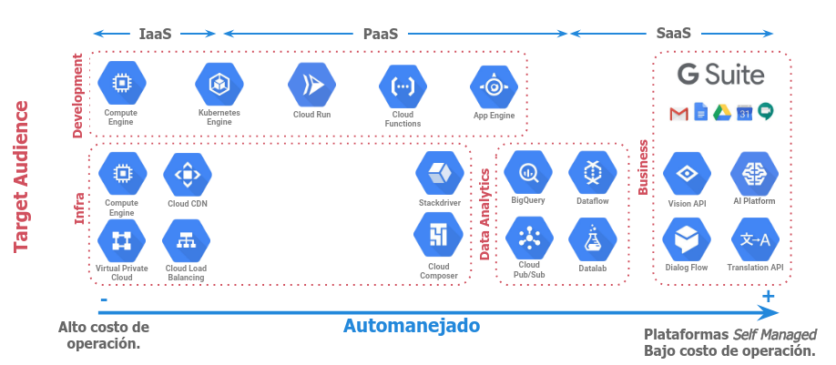 En el siguiente diagrama, se ven servicios del ecosistema Google en diferentes lugares de la piramide de abstracción: