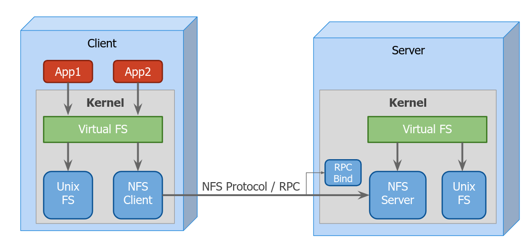 Requiere de una abstracción del kernel llamada Virtual File System. Las aplicaciones utilizarían VFS para acceder los archivos, lo que requiere de una invocación remota.