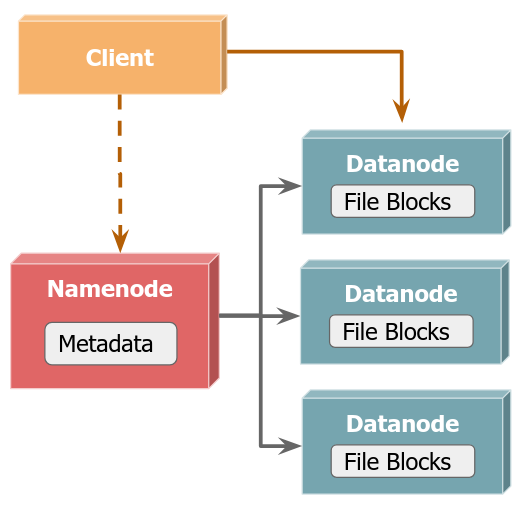 - Un namenode que conoce donde está cada porción de cada archivo y contiene toda la metadata.