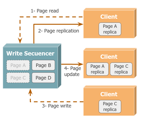 Si queremos permitir lectura-escritura, entonces el servidor funciona como un secuenciador de operaciones. Las páginas se encuentran en múltiples lugares a la vez, y el servidor debe notificar a las réplicas cuando se deben actualizar las réplicas.