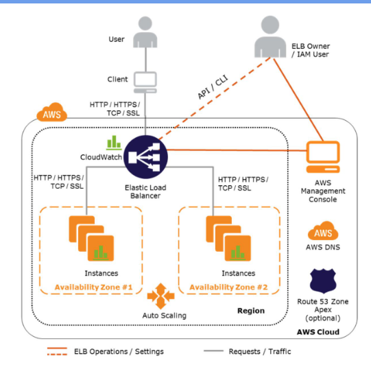 - Como application load balancer, utiliza Amazon Elastic Load Balancer. Este redirecciona tráfico a instancias (EC2), incluso en diferentes zonas. Además, interactua con instancias para verificar su estado.