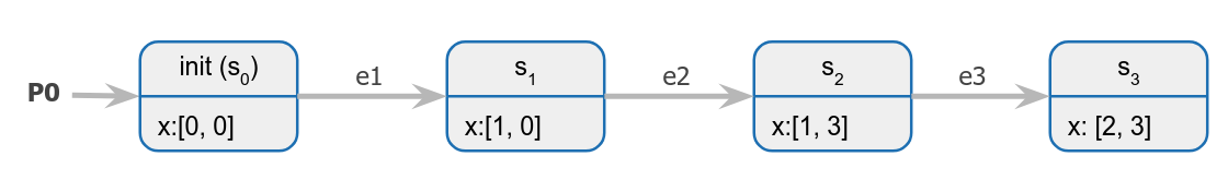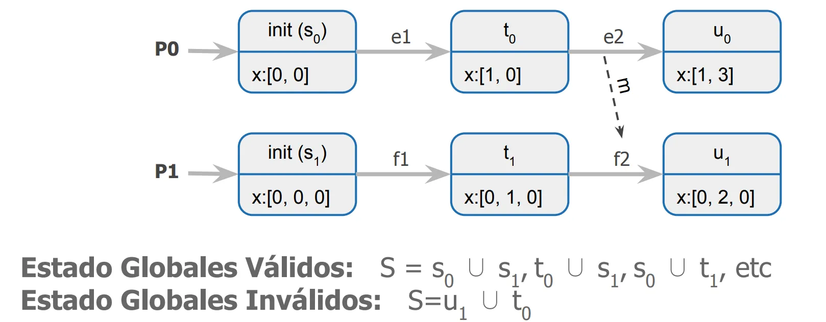 En este ejemplo, el estado es válido, pero el estado no lo es, puesto que depende del mensaje enviado por el evento , que ocurrió luego de .