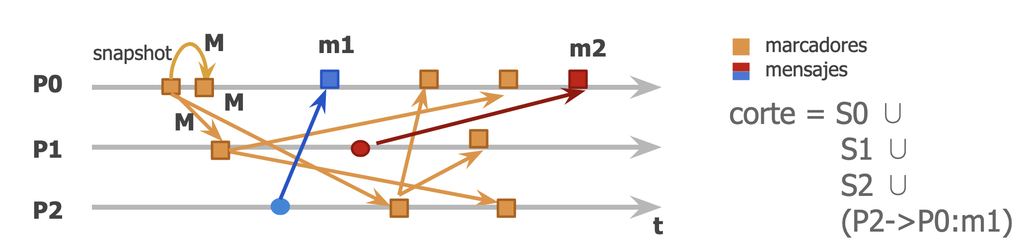- Inicio del algoritmo: Cuando un proceso observer quiere generar un corte, guarda su propio estado y envía un marcador al resto de procesos.