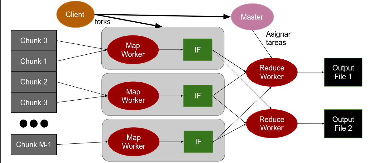 map: (input shard) -> intermediate(key/value pairs)No se puede llamar a la función reduce hasta que se hallan procesados todos los datos, por lo que los datos intermedios se guardan en un archivo intermedio (IF). Una vez procesados todos los datos, se le notifica al master la ubicación del archivo master.