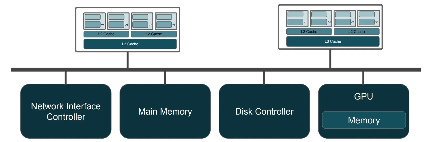 - NUMA (Non-Uniform Memory Access): Cada procesador tiene memoria local, para la cual tiene mayor ancho de banda. Recientemente se empezó a ofrecer en cloud.