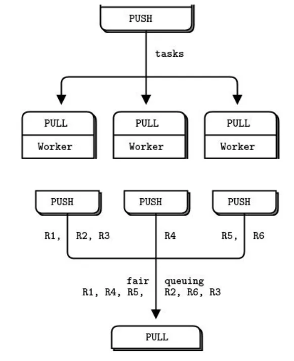 Es un modelo basado en comunicación por tareas entre productores y consumidores.