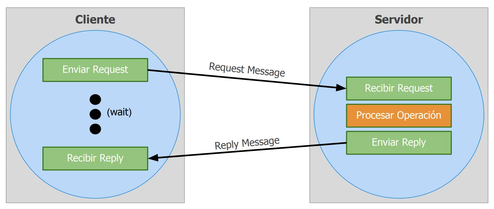 Un nodo envía un mensaje, y el otro nodo responde con otro mensaje. Es sincrónico.