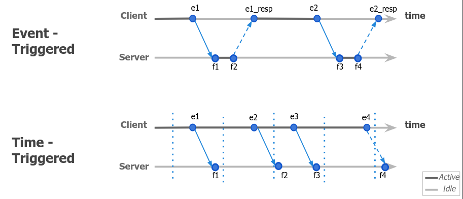 Hay dos paradigmas de trabajo. En los sistemas event-triggered, hay un actor que hace consultas, y otro que responde (denotado como servidor, pero puede ser cualquier cosa, como un sensor).