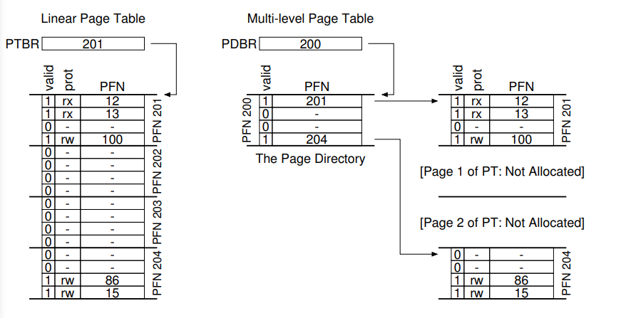 En esencia, la multi-paginación utiliza tablas de multi-nivel. Los directorios tienen una cantidad de PDE o page directory entries. Mínimamente, estos contienen un bit de validez y un PFN, el frame donde se encuentra la tabla de páginas.